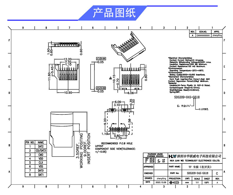 TFSD 卡座9P/F (贴片小卡槽)
