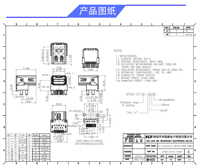 MINI DP 20PIN SMT式 无弹片( 贴膜)