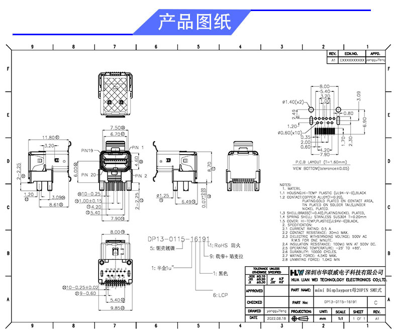 MINI DP 20PIN SMT式 带弹片(贴膜)