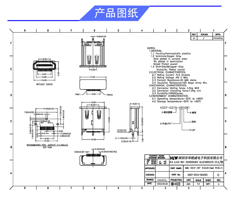 HDMI 19P/F 立贴贴片 (高度15.0)