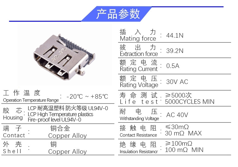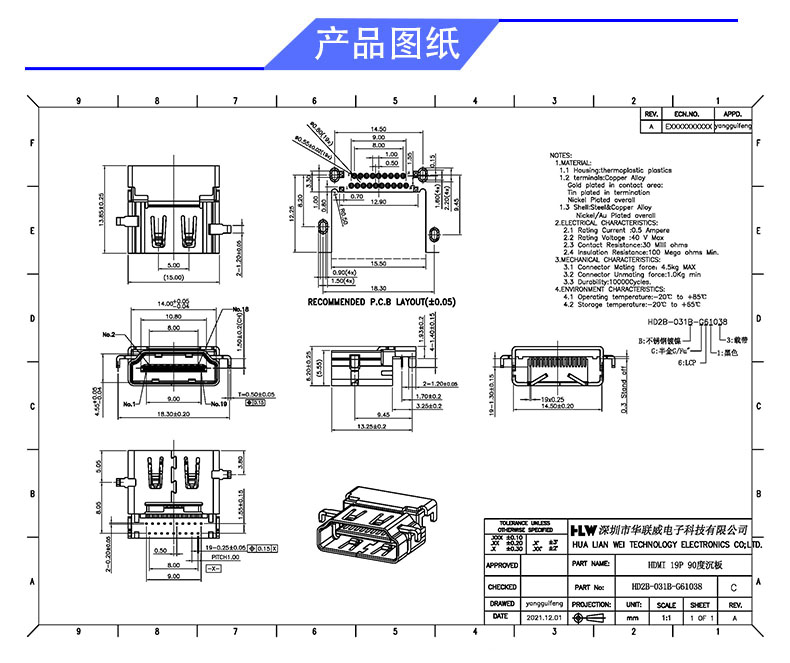 HDMI 19P/F 90度沉板(反向高度1.5)