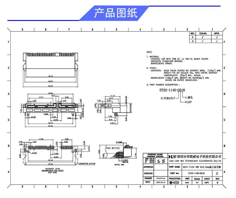 SATA 7+15P SMT 板上(高度6.74)