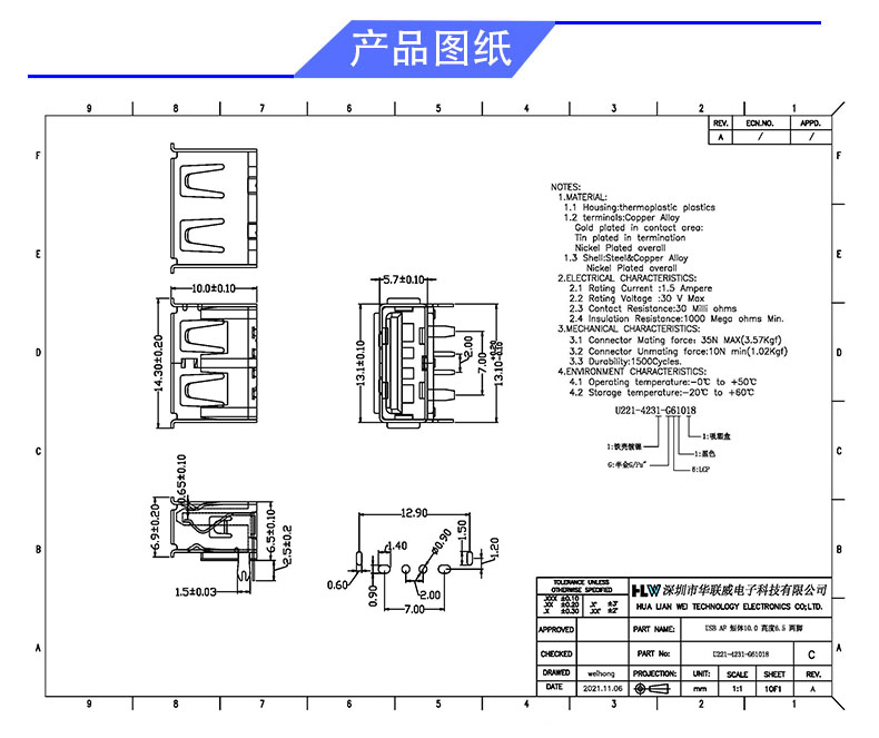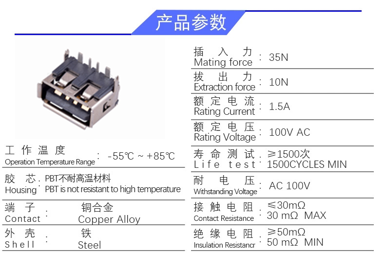 USB AF 短体长度10.0 高度6.5 (大电流 )