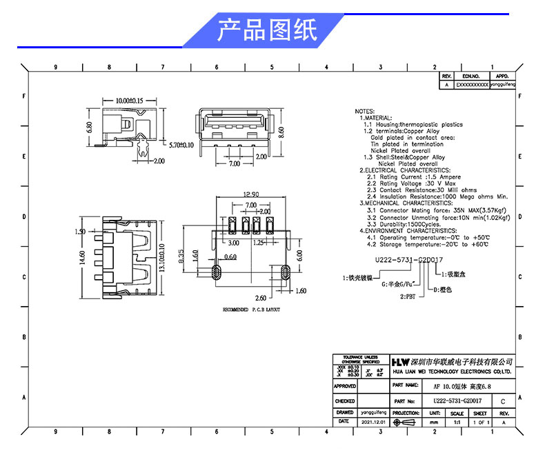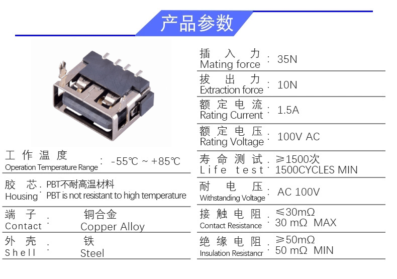 USB AF 短体10.0 SMT 两脚无卷边(高度6.8)