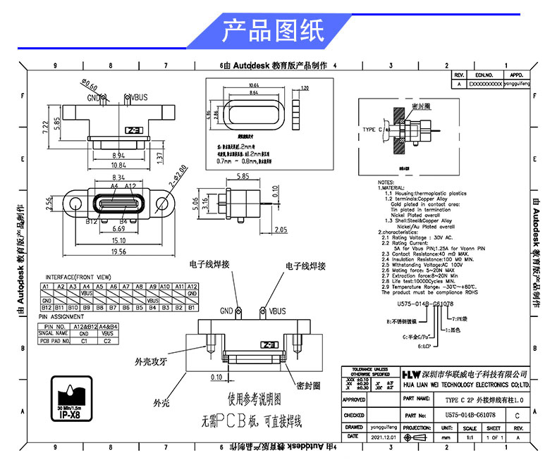 TYPE C 2P/F 外接焊线(有柱1.0)