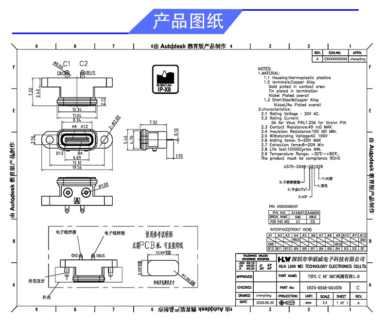 TYPE C 2P/F 外接焊线带耳(有柱1.0)
