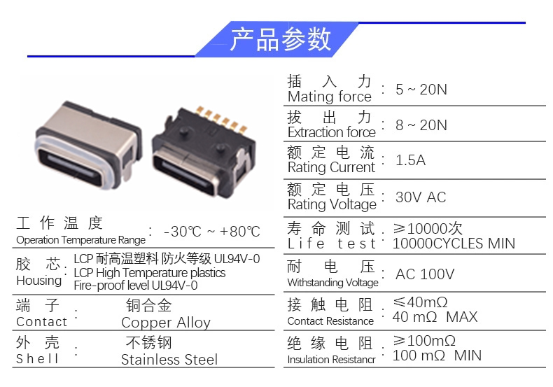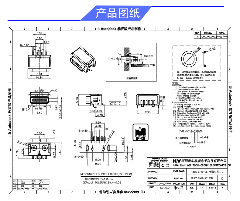 TYPE C 6P/F SMT 防水 两脚(有柱1.0)
