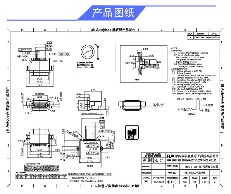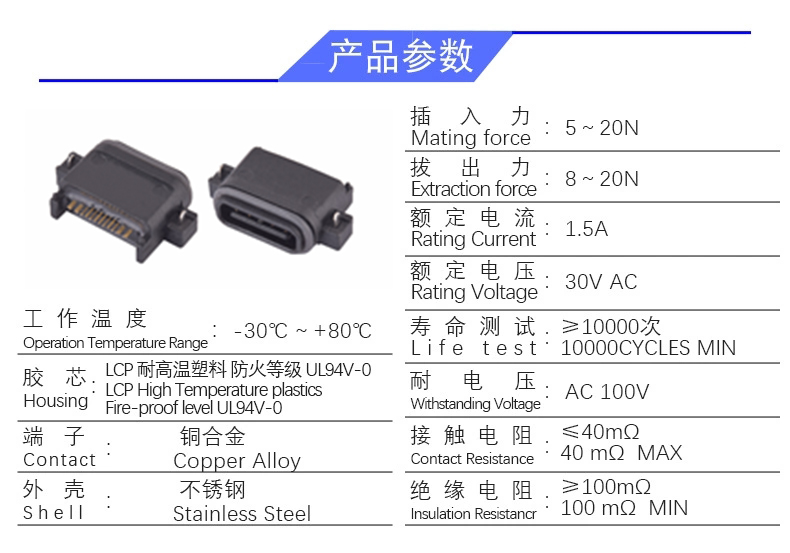 TYPE C 16P/F SMT 防水两脚有柱(全塑)
